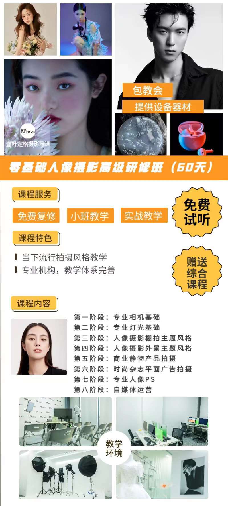 第一阶段:专业相机基础(曝光三素 测光对焦 构图 景别 等等) 第二阶段:专业灯光基础(灯光附件 灯位 多灯 人像布光等等) 第三阶段:人像摄影棚拍主题风格(肖像照 纯欲风 复古风 等等) 第四阶段:人像外景主题主题风格(小清晰 古风 闺蜜 儿童 等等) 第五阶段:商业静物产品拍摄(玻璃制品 服装 化妆品 等等) 第六阶段:时尚杂志平面广告拍摄(创意 杂志 淘宝服装等等) 第七阶段:专业人像PS(像素蛋糕 穿帮 蒙版 磨皮 等等) 第八阶段:自媒体运营(个人IP打造 手机修图 手机短视频拍摄剪辑)