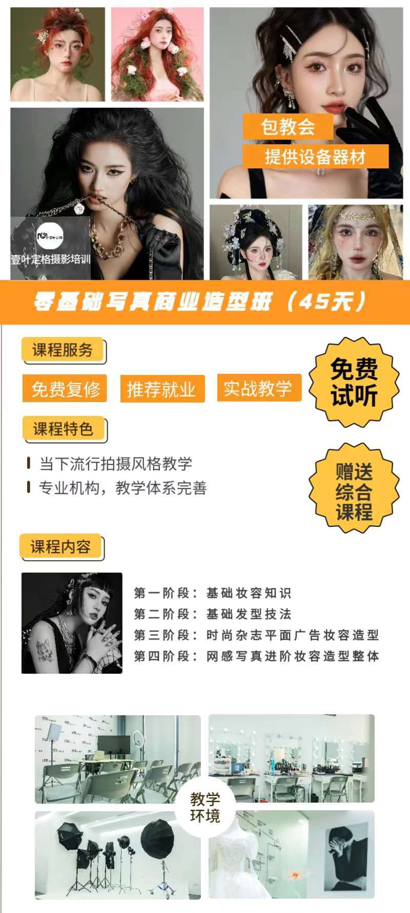 第一阶段:专业相机基础(曝光三素 测光对焦 构图 景别 等等) 第二阶段:专业灯光基础(灯光附件 灯位 多灯 人像布光等等) 第三阶段:商业静物产品拍摄(玻璃制品 服装 化妆品 等等) 第四阶段:时尚杂志平面广告拍摄(创意 杂志 淘宝服装等等)