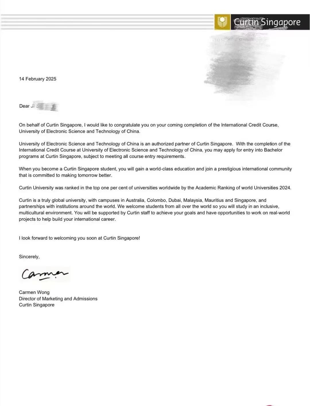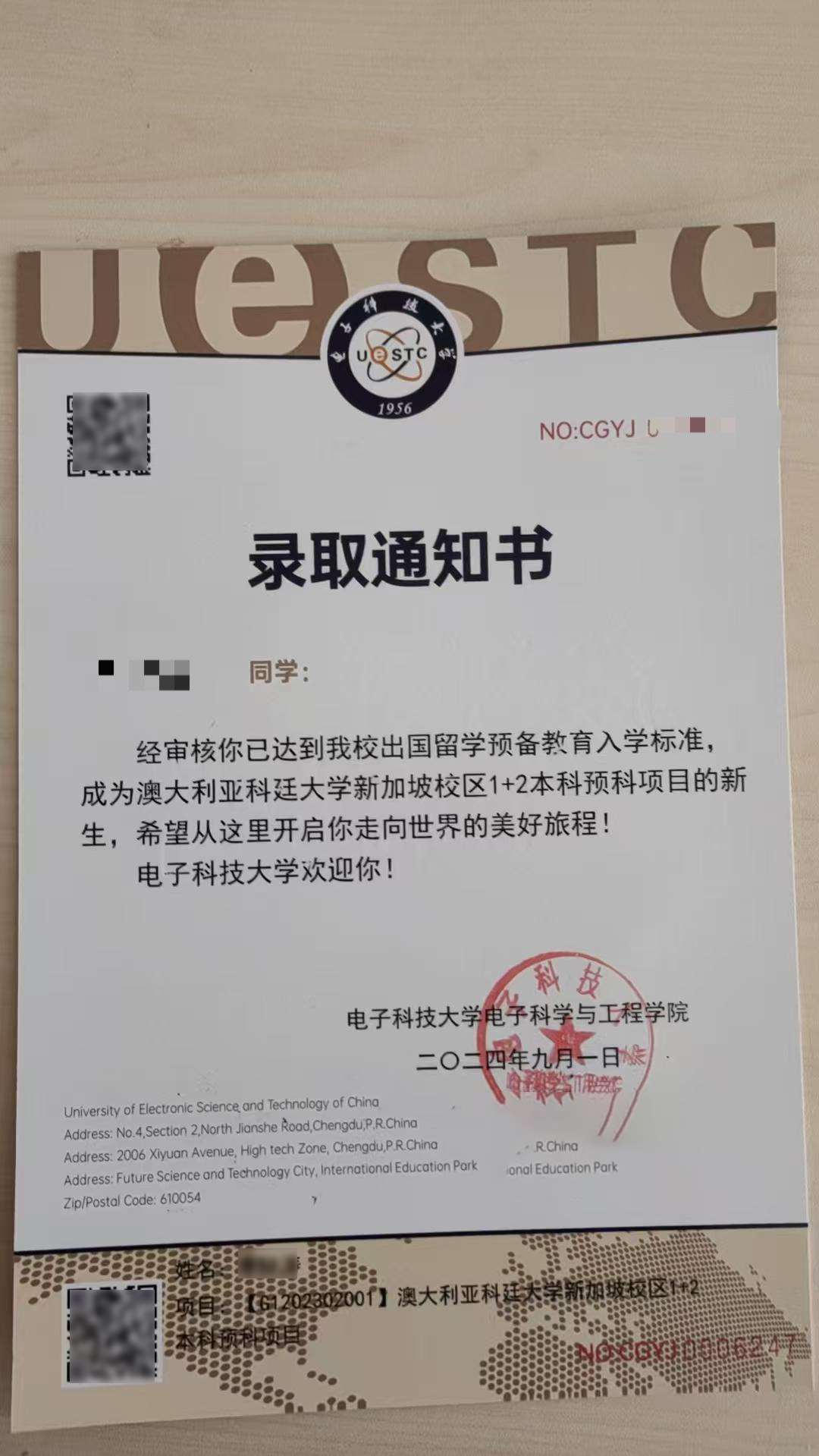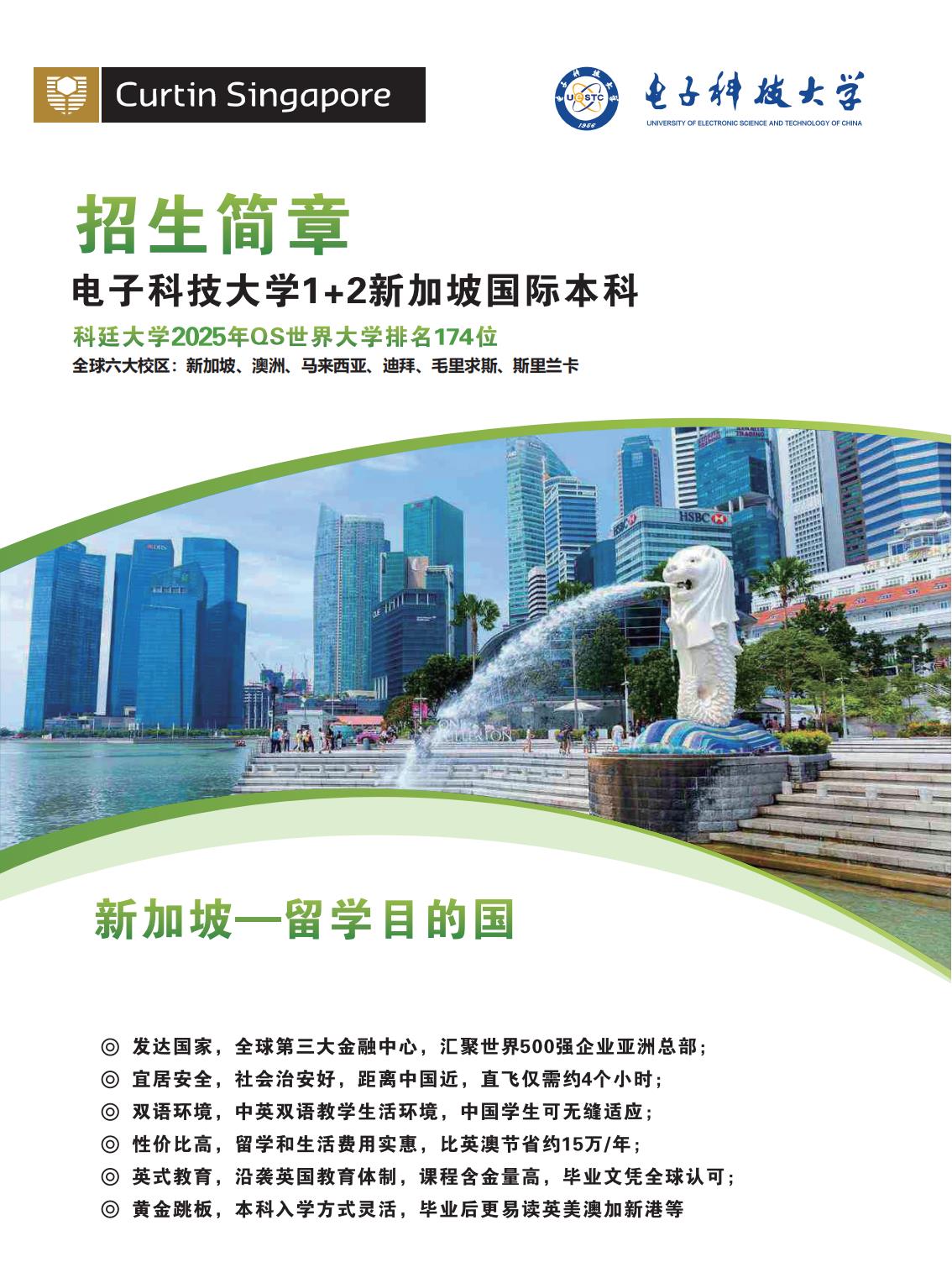 课程详情:如果学生选择的是1+2项目,该项目第一年在电子科技大学就读,之后两年在澳洲科廷大学新加坡分校就读,修满国外大学规定的学分课程,可以得到科廷大学本科学位。第一年就读期间享受电子科技大学校内资源,学生完成首年国内课程后,由电子科技大学颁发项目分数单和结业证书。