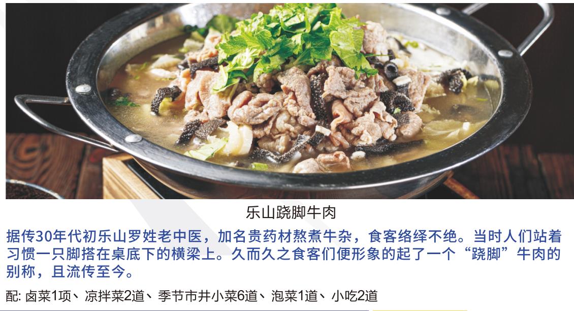 乐山跷脚牛肉据传30年代初乐山罗姓老中医,加名贵药材熬煮牛杂,食客络绎不绝。当时人们站着习惯一只脚搭在桌底下的横梁上。久而久之食客们便形象的起了一个“跷脚”牛肉的别称,且流传至今。配:卤菜1项丶凉拌菜2道丶季节市井小菜6道丶泡菜1道丶小吃2道