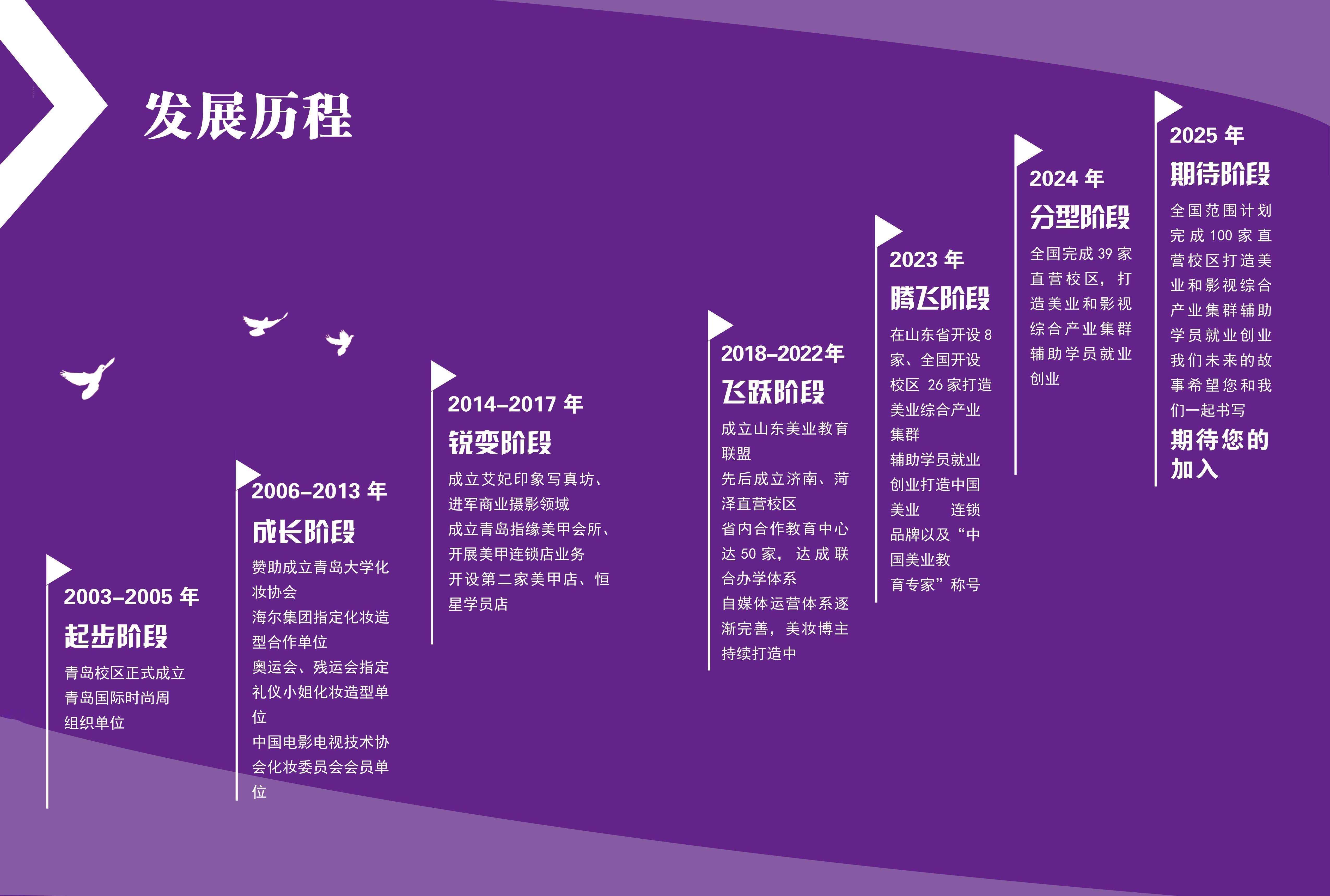 紫缘教育集团创立于2003年,是国内资质最老的一批美业培训机构之一。在过去的22 年,中国发生了翻天覆地的变化,美业和美业培训机构也在市场经济的变革中不断推陈出新,完善自我。紫缘也看到大量同期的培训机构因不符合市场发展的要求而被淘汰。经过22年的发展,紫缘重视教学、教研、技术研发,已成为国内美业教育培训领域的首部梯队。我们的培训课程主要有化妆、形象设计、美甲美睫、美容美发半永久纹绣、摄影摄像等美业培训及美业相关产业,每一个板块都经过了22 年的积累和沉淀,整个教学、就业体系非常完善。紫缘不仅是自营教育培训,而且为国内大量教育培训机构提供服务。包括为其他机构提供广告投放、自媒体运营、课程输出、师资培训、客服外包、员工培训等支持工作,是国内美业教育S2B2C模式的践行者。目前我们在全国有40余家直营分校,先后在山东省济南、菏泽、临沂、潍坊、烟台、聊城、济宁、泰安、德州,以及河北省石家庄市、保定市,天津直辖市,河南省郑州市、周口市,广东省广州市、深圳市,湖南省长沙市、衡阳市,山西省太原市,四川省成都市,安徽省合肥市、阜阳市,浙江省宁波市、嘉兴市,辽宁省沈阳市,陕西省西安市,贵州省贵阳市,江苏省南京市、徐州市,云南省昆明市,广西省南宁市,江西省南昌市、赣州市,黑龙江省哈尔滨市,重庆直辖市等地开设直营校区,学校教师突破1000 人,每年服务的学生和家长超 2万人。[企业愿景]打造中国美业教育专家[企业使命]圆梦学员 成就员工[企业价值观]客户为先 合作共赢 精益求精 拥抱变化