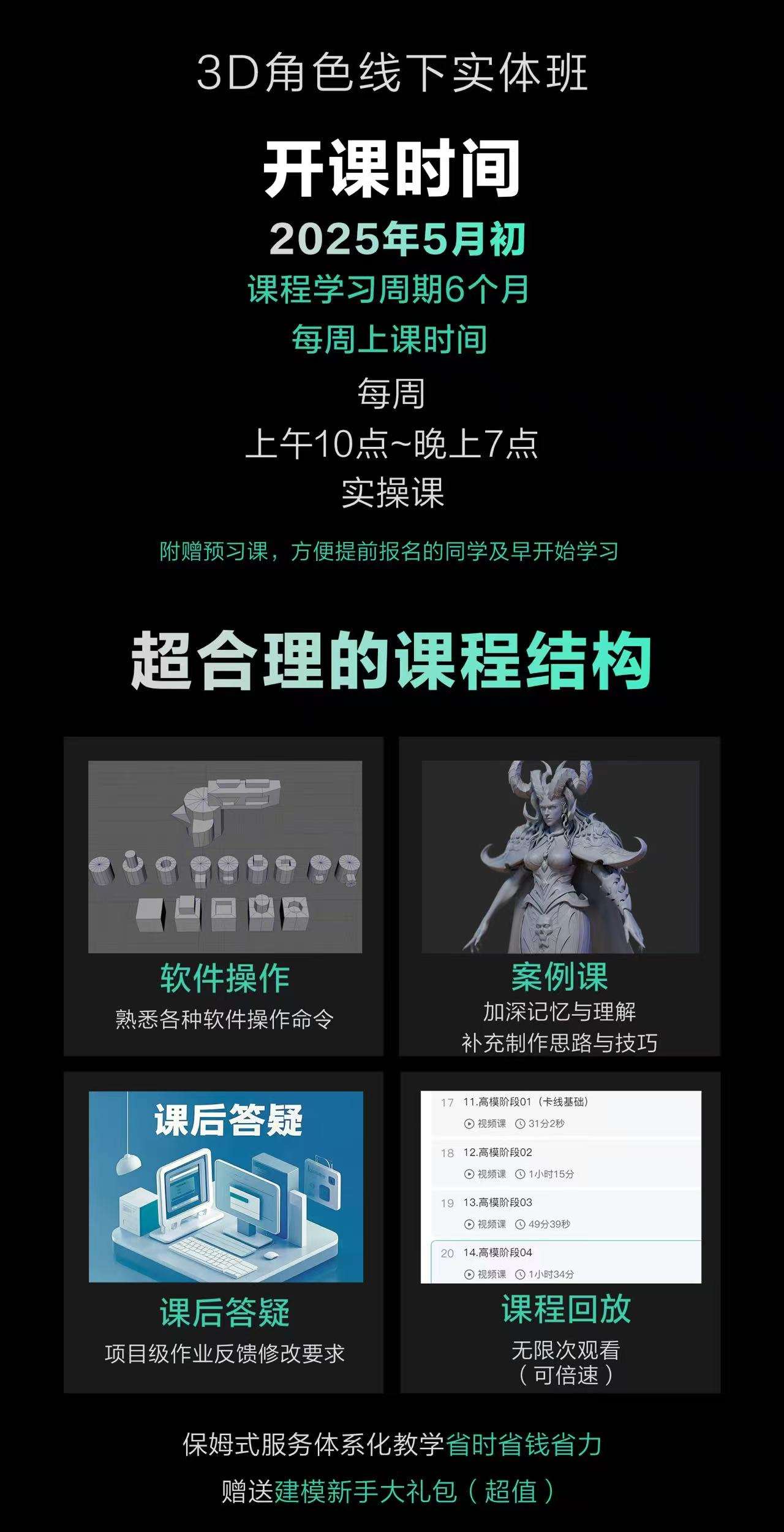 我们一直专注于游戏动漫、手办潮玩、影视动画行业的人才培养,以贴近实际项目工作的内容来教学,为行业培养了非常多的优秀人才。学院目前围绕3d建模领域,开设网络课程及线下课程两种模式,课程涵盖角色与场景两大方向,线上班包括:3D角色就业班、3D场景资产班、3D建模基础班、Nomad手办班、人头人体造型进阶班等专业课程。2025年,游塑学院线下校区在重庆永川正式落地,适合新人小白的线下角色班在2025年5月正式开启,未来还将推出线下场景资产班,3D特效班等。