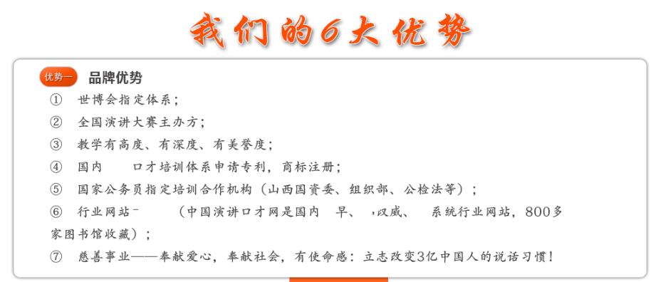 重庆语慧教育信息咨询服务有限公司是研究语言的、智慧、实践、运用、发展的专业机构,包括:语言表达、即兴讲话、主持艺术、演讲艺术、商务谈判、高效沟通等语言形式。公司是由李庆军老师创办,他经过20年的时间精心研究,根据中国人的说话习惯和神经语言程式学(NLP)而形成了一套适合中国人学习的语言训练体系——国际ATT。 公司旗下拥有:语慧国际商学院、新职联职业培训学校、中国演讲口才网。 全国合作机构:北京大学光华管理学院、清华大学职业经理人训练中心、人力资源和社会保障部、湖北卫视空中商学院等。目前已在北京、上海、杭州、成都、新疆、等20个城市创办了合作机构。企业文化我们的精神是:专注专业,品质卓越我们的信念是:目标是我的责任,荣誉是我的生命!我们的目标是:创造企业辉煌,成就个人梦想!我们的准则是:积极进取有担当,认真服从有目标,专业智慧有表现!我们的使命是:立志改变3亿中国人的说话习惯!我们的愿景是:成为每一个华人登上人生辉煌舞台的基石。忠诚:忠诚于国家,忠诚于公司团队:团队至上,个人退后感恩:以忘恩为耻,以感恩为荣我们的核心理念生命理念:唯有正道才能立足天下创业理念:持续发展,共创辉煌发展理念:牺牲小我,完成大我经营理念:会说话,赢天下行销理念:迈向成功,与我同行服务理念:以客户为中心,用爱做服务品牌理念:品牌创造价值,价值造就财富财富理念:口才即人才,有才总有财成长理念:心智得到锻炼,希望永远不变做人理念:倾财足以聚人,量宽足以得人,身先足以率人,律己足以服人晋升理念:成长,成熟,才能成功结果理念:只有结果,没有如果