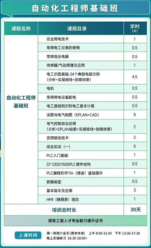 自动化工程师基础班主要学习内容:常用低压电器(原理/识图/接线);识读PLC程序;故障排查;简单控制柜配盘;综合实训(一)。