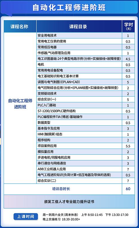自动化工程师进阶班主要学习内容:常用低压电器(原理/读图/选型/接线);识读PLC程序;编写常规PLC程序;故障排查;中等控制柜配盘;ABB机器人基本操作; 综合实训(一);综合实训(二)