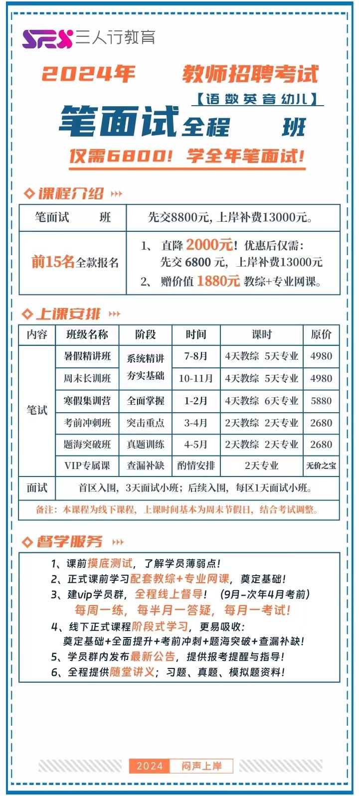 关于三人行三人行教育—“三人行,必有师”。立足于湖南本土,致力于打造湖南教师招聘考试培训个性化高端教育品牌。我们早已在教师考编行业耕耘多年,深谙湖南省教师考编的特点、区县考情的差异化、卷面难度的大相径庭、日趋严峻的竞争形势,也深知市面上眼花缭乱的课程根本无法满足广大考编老师的需求;在课程上,我们打破常规、传统课程培训体系,推出“模块化”“层次化”“区域化”“个性化”教学辅导、“尊享一对一”、“高端私人定制”等课程理念。给予每个学员一套因材施教的教学计划,.大程度地尊重和关注学员的个性差异。 在教学教研上,我们拥有众多明星老师、教育专家和教育研究学者,教学实力雄厚。并积极研究先进教学方法,以精准,精密,精确的教学原则,摒除常规教学的随便,随性,随意形态。以优质的教学质量和教育产品,助力服务对象能力增长,效果提升。我们将持续秉承稳健发展、求实与创新的企业精神,坚持以"服务为导向、教学为根本"的运营理念。凭借着.的师资队伍、专业的服务团队和完善的管理模式,不断整合优秀的教育资源,为学生提供更专业化、个性化的教育服务。为了解决目前市场上课程无区域针对性、无个人针对性、师资匹配程度低、学员后期服务严重溃泛等问题,三人行,由此诞生。我们着力于开发有个性,有针对性的课程;完善高质量的教学教研师资队伍;提升对学员的咨询、督学服务。我们将持之以恒,精益求精,只为迎三人行的广大学子快速上岸!三人行的优势为您带来全方位三对一1、课程顾问:为您带来.匠心的课程体系!2、授课师资:为您带来.称心的教学质量!3、教务老师:为您带来.贴心的督学服务!三人行教师选用原则1、专业功底深厚,熟悉湖南各地考试信息,对考点把握准确到位;2、资深教育背景,历界教师招聘考试考官,评分得分更专业指导;3、教学经验丰富,擅长因材施教,以更大耐心和专业辅佐您上岸;三人行给您的承诺1、对教务服务安排不贴心可*;2、对教学师资匹配不满意可*;3、杜绝虚假存在夸大其词可*;