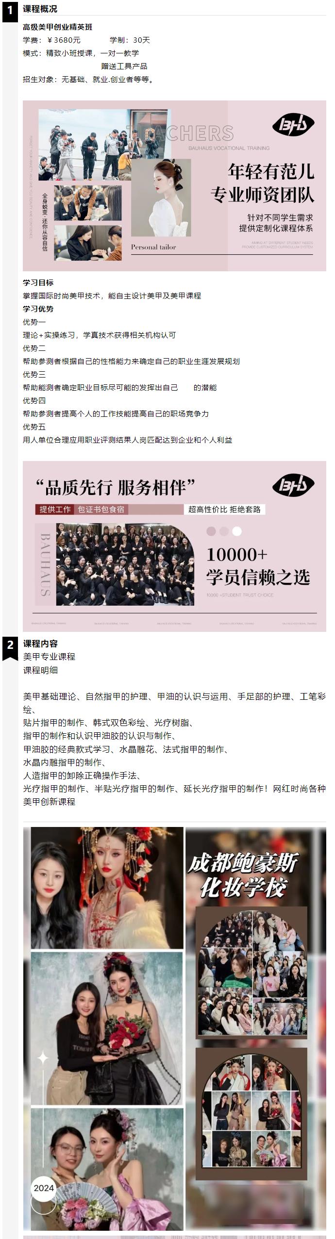 鲍豪斯(成都)形象设计是一家集高端美发,摄影,化妆,短视频,自媒体技术研发、推广、教育、资讯于一体的综合性培训学校,总部设在中国的经济政治文化中心首都——北京。以“世界中国化,中国世界化”的创新思想,将尖端的技术与时尚生活融为一体,快长成为西南地区高端时尚教育的新标杆。鲍豪斯(成都)职业培训设立在西南地区的高新技术产业基地、商贸物流中心和综合交通枢纽、西部地区重要的中心城市——成都。鲍豪斯交通便利,地铁在建,公交汽车直达机场,火车站,设施配套齐全,因此发展十分迅速。周边有大型商场两座——上古天地,锦绣广场,购物休闲非常方便,学习累了,可以看看电影,运动健身,美食应有尽有,尽在其中,高端奢侈品牌......周边配套设施齐全,学校综合办学条件优良,校区错落分布、疏朗有致,格调清新、宁静幽美、四季如春。既有运味十足的健身器材,又有修剪整齐的花园、绿地,也有种类丰富的植被、树木。被誉为西南地区“花园式学院”,学员可以全身心投入到学习的海洋,是美业学子们学习进修的理想园地。  鲍豪斯(成都)形象设计遵循“注重安全、服从管理、包容协助、自理自立”的宗旨,本着“爱心、耐心、责任心”的原则为学员服务。实现“让学员舒心、家长放心”的办学目标。  同时我校采用国际先进的Different-TSA教学模式,真正让你起步就与国际接轨,让学员能享受到世界优质教育资源,实现不出国门也留学的梦想,也让学员走向了世界,让学员走出了国门。    鲍豪斯(成都)形象设计采用“真人教学、老师亲传,校长亲授,精品教育、私塾教学”这一教学模式。秉持激发学员学习兴趣及潜力,教授学员正确学习方法,培养学员良好学习习惯的教育理念,全方位个性化辅导,倡导 “快乐、高效学习”。始终以为学员提供优质的教学服务为目标,带给学员的不仅仅是优质的专业技能,更是培养受益终身的学习动力和能力! 成都鲍豪斯形象设计成立以来,为西南地区培养了大批精英人才,多数同学都站在西南美业的前沿。  有的创立了自己的美发沙龙,婚纱影楼,写真工作室,有的同学成为一线品牌的总监,与收入均已过万,更成为成都鲍豪斯的骄傲,鲍豪斯成都虽然已经取得了傲人佳绩,但始终坚信“生命不息,创新不止,良心品质,爱岗敬业”的教育精神,一直奔跑在路上,从不敢懈怠。  鲍豪斯教育团队和世界各地高端美业教育机构始终保持着紧密合作,随时汲取世界各地先进的理念和时尚元素,随时升级和改造自己的教育体系。正如业界大师所说:鲍豪斯教育团队是西南美业与中国和世界各地交流的桥梁,更是西南地区美业潮流的制造地和美业精英的西点军校。不仅如此,鲍豪斯教育更是国内自研教材教学,“传播先进教学理念,提供科学教学方法”是鲍豪斯教育的教学宗旨。  线上线下相结合教学模式是鲍豪斯与时俱进的标志。李彩文、颜凯恩,羽东从事十余年经营、教学、管理工作,是国内首批将在线平台与学校教学改革相结合的践行者。  学院拥有课程制作团队、技术团队、教学设计团队,为学院和教育类企业提供线上线下相结合的教学模式设计和服务,是目前在线教育行业的提倡者及实施者。