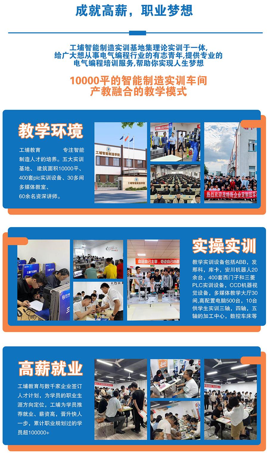 江苏工埔教育科技有限公司简称工埔教育,2012年,在苏州设立工埔教育智能制造实训基地,坐落于工业重镇昆山市。专注智能制造和新工科人才培养领域,为社会培训专业人才。院系设置六大专业:工业自动化,模具设计,CNC数控编程,工业机器人,CCD机器视觉,非标机械设计等热门课程。 工埔教育是一家专业智能制造人才培养综合企业,工埔教育拥有昆山总校,城南校区,吴中校区,常州校区,南通校区五大实训基地。坚持“为学员找未来,为企业造匠才”的办学宗旨,在长三角地区进行品牌战略扩张,致力于打造智能制造高技能工业人才培养基地。 工埔教育拥有专业教学水平的高素质师资队伍,具有实践经验和科研水平。工埔教育实施人才战略,坚持高端引领、协调发展、人尽其才的工作原则,注重人才队伍的建设,汇集海内外行业领域专业人才,培养高端师资及人才支撑。工埔教育采用三维循环教学模式,即:一人教、二机练、三实战。工埔教育建筑面积10000平方米,现有教职工近100人,采用国内专业的智能制造工业人才培养体系和教材,配备机器人现场实战培训。教学实训设备包括ABB,发那科,库卡,安川机器人20余台,400套西门子和三菱PLC实训设备,CCD机器视觉设备,多媒体教学大厅30间、高配置电脑500台,10台供学生实训三轴,四轴,五轴的加工中心,数控车床等,工埔教育完成进一步转型升级,创新办学,不断提高教学质量,为社会培养更多的复合型人才。