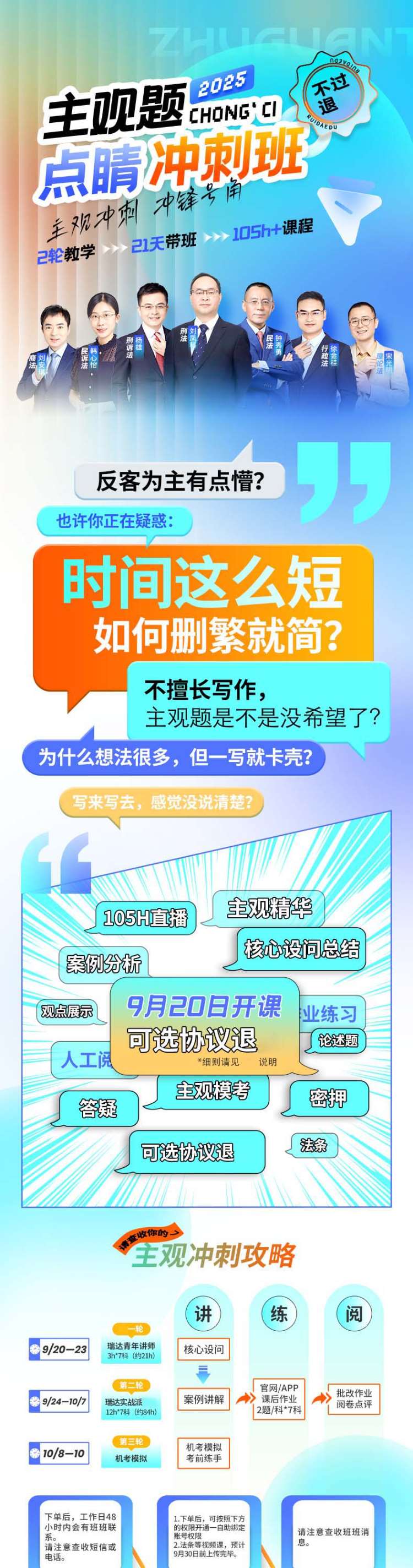 经济法学博士。法考界少有的,集美貌与智慧于一身的女子。在她的课堂上,商经法庞杂如钢铁般生硬考点,瞬间化作绕指柔。她授课干练、高效,能让考生在课堂上就记住考点,击破真题,深受考生爱戴。她说:商经法,纳商事之规,言世事之责。人送外号:晗神。所授课程:《2023成泰至尊C(北京)》《2023瑞志起航班C(北京)》《2023瑞成周末起航直播课(北京)》《2023成泰精英班(北京)》《2023瑞成周末精英班直播课(北京)》《2023成泰至尊班VIP(上海)》《2023成泰至尊班A(上海)》《2023成泰至尊班B(上海)》《2023成泰至尊班C(上海)》《2023瑞志起航班VIP(上海)》《2023瑞志起航班A(上海)》《2023瑞志起航班B(上海)》《2023瑞志起航班C(上海)》《2023瑞成周末起航班(南京)》《2023瑞成周末主客一体(南京)》《2023瑞志长训班B(南京)》《2023瑞志长训班C(南京)》《2023瑞志长训班VIP(南京)》《2023成泰集训班B(南京)》《2023瑞志起航班C(杭州)》 详细