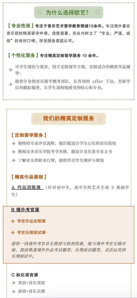 欧洲音乐艺术交流中心是一个国际高规格的艺术类交流、学习平台,以保录为特色,专注一线音乐学校的留学服务,我们的服务宗旨是一切为了孩子的将来,我们的核心竞争力是专业评估,优秀的文书制作团队,完善的境外跟踪服务,以及强大的师资力量和专业的培训机制,并且为学生提供海外游学、国外教授考官课等服务。为中国地区的音乐爱好者提供音乐类相关的优质服务项目;在昆明、宁波、长沙、河南、上海、临沂、重庆等地区搭建校级合作关系,为境内的音乐类学校搭建优质的音乐国际文化项目。