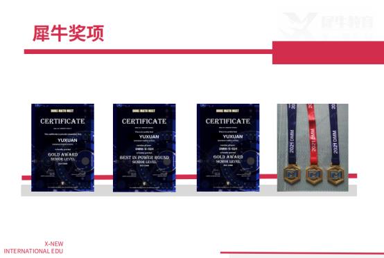 关于犀牛犀牛教育(X-NEW),由业内多名教学专家共同组建,不乏来自加州理工学院、剑桥大学、清华大学、北京大学、复旦大学、新加坡国立大学等国际大学。其中有博士、硕士的学历老师众多,学术功底扎实,有的已经执教十余年,国际教育领域经验丰富。品牌历程2019 创立期犀牛创立的时候选择了X-NEW作为品牌名,X表示未知、无限,寓意无穷的可能性;NEW表示新的,寓意学生新的未来。2020 组建期犀牛在徐家汇25 楼 180 平不到的办公室里诞生。犀牛的这一年,是屡败屡战;而且犀牛的成立,本身也是屡败屡战的又一次春红。2021 激荡期犀牛确定了以和竞赛为主的未来方向,服务群体为国内广大的国际学校高中生。希望犀牛可以带给孩子们除了分数之外的更多价值。包括不限于踏实、积极、高效、机敏、逻辑清晰、思维发散等。上海扩展长宁、浦东、黄浦三校区。2022 规范期犀牛已经服务过超300位学生。目前在读学员,有超150位。犀牛则完成了内容沉淀,老牌高中例如平和、世外、包玉刚、UWC,犀牛都已经有了充足的经验。不断的复盘和内容积累,对时间节点的把控,润物细无声,结合IB的要求从上帝视角给学生充足的支持。犀牛北京、南京、无锡、苏州、杭州、广州、深圳、青岛校区建成。
