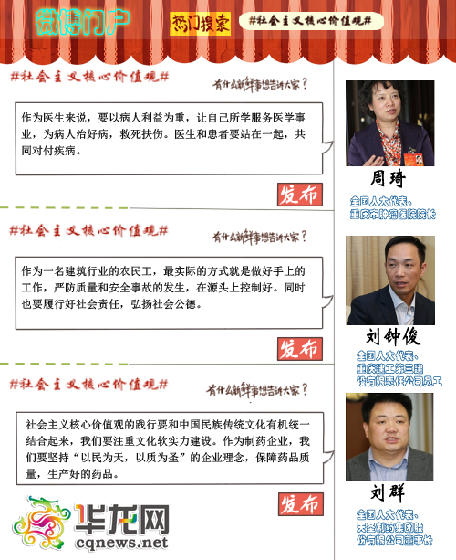 华龙网北京3月11日9时35分讯(记者 黄军)富强、民主、文明、和谐,自由、平等、公正、法治,爱国、敬业、诚信、友善,这24个字概括了社会主义核心价值观。在工作生活中,我们要如何践行这样的价值观?来看重庆三位基层全国人大代表的“微语录”。