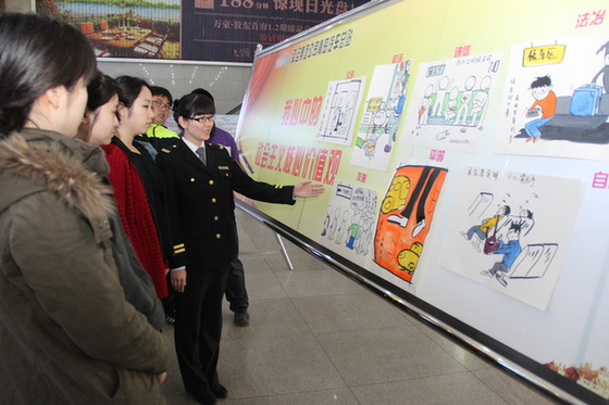 为了更好的践行社会主义核心价值观,并传播给来自全国各地的旅客,近日,交运集团青岛汽车总站在候车厅里举办了“我心中的社会主义核心价值观”图画展,车站员工们将社会主义核心价值观与旅客的出行紧密联系,采用手工漫画的形式展现了排队候车、遵守交通秩序、文明礼让、不带危险品乘车等内容,用这种直观的方式让旅客对于社会主义核心价值观有了更多更好的了解。(通讯员 李男)