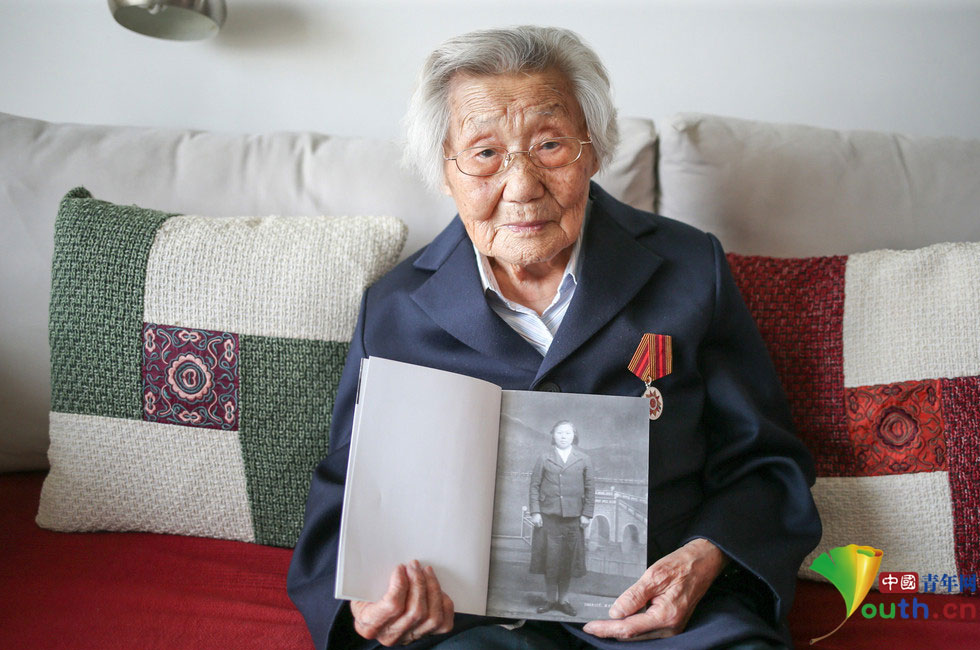 2015年4月28日,北京,朝鲜籍女战士,97岁的李在德老人现在居住在通州的一个普通住宅小区。满头白发,下楼散步,跟谁都微笑。李在德老人曾撰写了一部回忆录,封皮上的老照片中,年轻时的她意气风发。