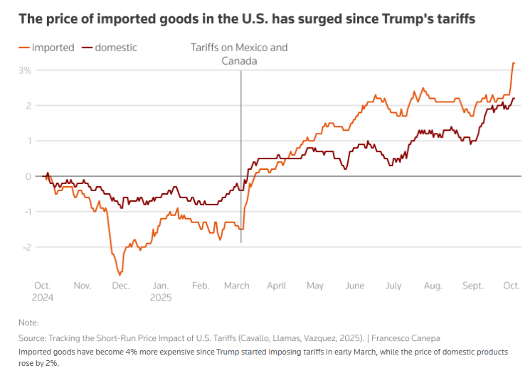 他们发现,自美国政府3月初开始征收关税以来,进口商品价格上涨了4%,而美国国内产品价格上涨了2%。其中,进口增幅最大的是美国国内无法生产的商品,比如咖啡。或来自土耳其等受到严重关税“惩罚”国家的商品。