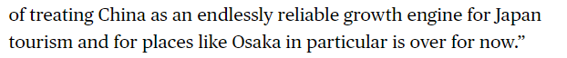 文章还援引华凯营销(China Trading Desk)首席执行官兼创始人苏布拉马尼亚·巴特(Subramania Bhatt)的话:“对日本旅游业、尤其是大阪等地来说,把中国视为一个持续可靠增长引擎的时代已经结束了。”