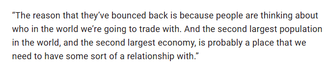 “人们都在思考我们应该和世界上的哪些国家进行贸易。(中国)作为世界第二大经济体,正是加拿大需要与之建立某种关系的原因所在。”