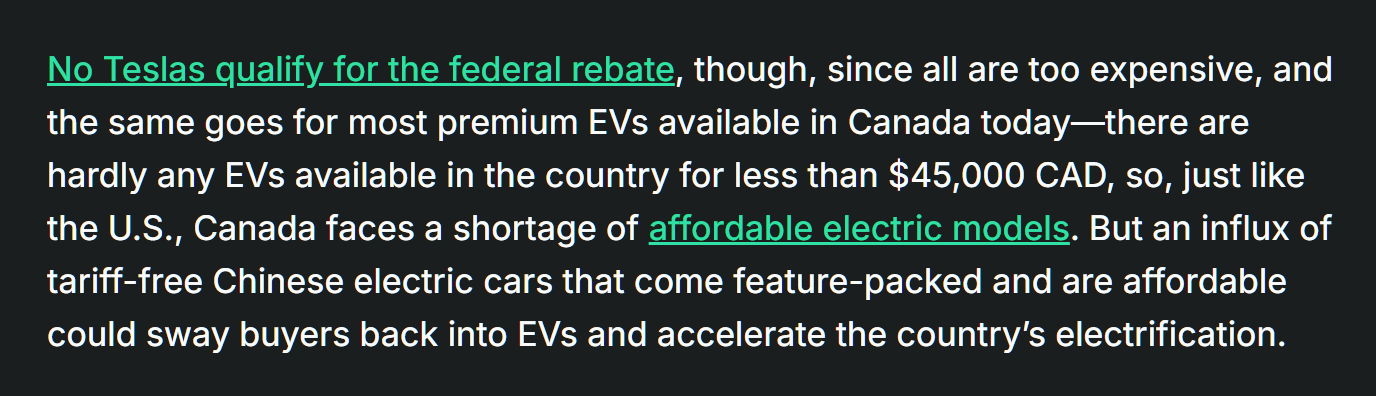 “特斯拉价格过高,所有车型都无法享受加拿大联邦政府的补贴。目前加拿大市场几乎没有售价低于4.5万加元的电动汽车。和美国一样,加拿大也面临着物美价廉的电动汽车产品短缺问题。但是,如果配置丰富、价格实惠的中国电动汽车能够免税进入,将会重新吸引消费者购买电动汽车,并加速加拿大的电气化进程。”