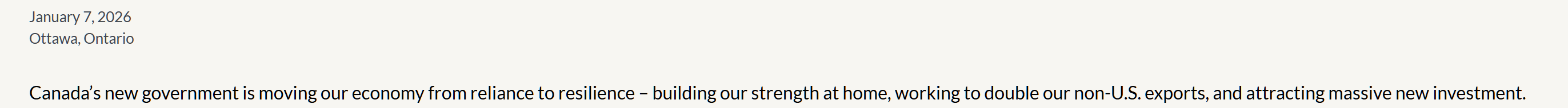 “加拿大新政府正在推动本国经济从依赖走向韧性——增强国内实力,努力使对美国以外的出口增长一倍,并吸引大量新投资。”