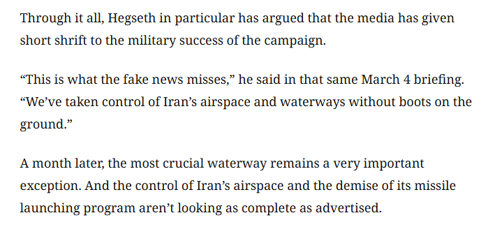 尽管如此,美国国防部长赫格塞思却抱怨说,媒体对此次战争所取得的军事成功未能给予应有的重视与报道。“这就是假新闻所忽略的事实,”他在3月4日的那场简报会上说。“我们未派遣地面部队,便已掌控了伊朗的领空与航道。”
