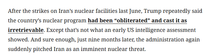 文章认为,去年6月美国轰炸伊朗核设施后,美国政府多次宣称伊朗的核计划已被“彻底摧毁”,“已无法挽回”。然而,美国当时的一份情报评估显示事实并非如此。果然,仅仅九个月后,美国政府又突然将伊朗描绘成“迫在眉睫的核威胁”。
