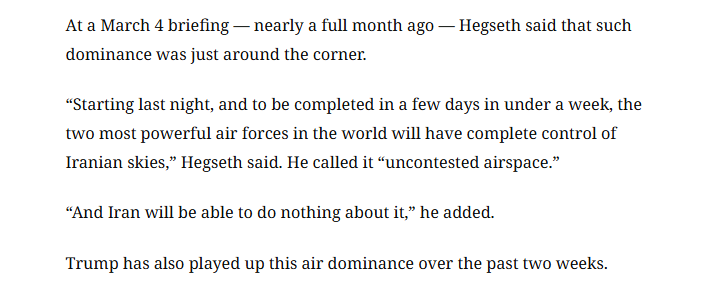 早在3月4日简报会上,赫格塞思就曾宣称,“从昨晚起,并在未来数日内、总计不到一周的时间,全球最强大的两支空军将实现对伊朗领空的全面控制。” 他将这一局面描述为“无对抗领空”,并称“伊朗对此将毫无办法”。过去两周,特朗普同样在大力渲染这一空中优势。