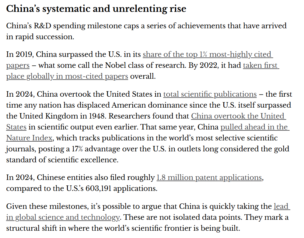 文章称,过去80年,美国依托对研究型大学、联邦实验室的持续公共投资以及开放的科研环境,建立起长期领先的科技体系。但如今,美国的这一优势已不再稳固。