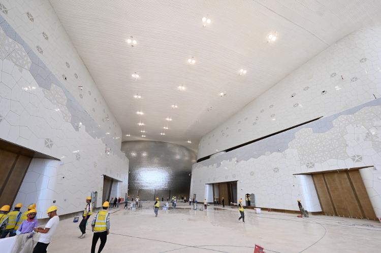 步入其中,波浪造型的穹顶映入眼帘,配合不规则的表面肌理,既延续了“上合之贝”的建筑形态,又描绘出了海波不惊,波光粼粼的空间意向。在综合馆迎宾大厅内的两侧幕墙打造上,中建八局发展建设有限公司用10300块造型各异的双曲面蜂窝铝板幕墙有序拼接,并对海浪图样做镂空处理,其上的发光亮片以聚与散的组合形成了繁花锦簇、向心汇聚的形态,“尊重多样文化、谋求共同发展”的上合精神与“海纳百川、四海升平”的大国气象呼之欲出。