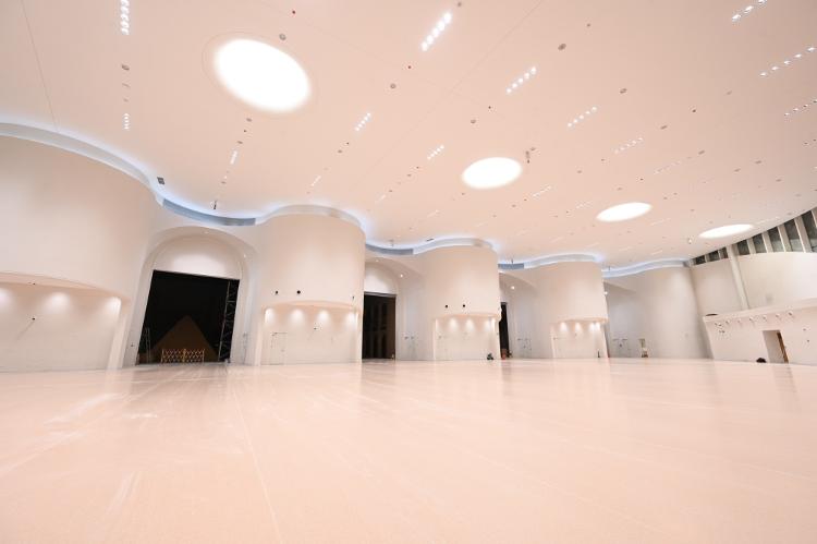 沿着海花广场向北而行,就到了整个项目的核心建筑——拥有2.3万㎡超大建筑面积及30米*111.2米超大尺度观海视野的综合馆。据了解,正式启用后,综合馆将用于承接各层级会议、举办高规格行业展览及大型商务洽谈等商事服务活动。
