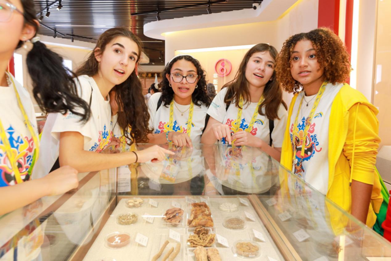 达仁堂药店内,来自西班牙的蒂娜正在认真观察展柜内的药材。“刚刚让我印象最深刻的是枸杞,它看上去红红的,我还以为会很辣,但没想到它是养生的食材。我很喜欢古文化街,这里可以吃到传统点心,看到传统服饰,也能感受到天津人的友好,我感到很放松,就像在家里一样。”