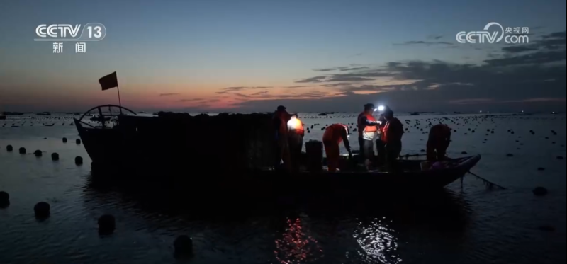 海面上,渔民的头灯在微亮的天色下闪烁格外醒目。大家各自忙活着,有的在收鲍鱼,有的在给鲍鱼投喂龙须菜。随着天色渐亮,满载鲍鱼的运输船陆续靠岸,新鲜鲍鱼被转运到车间进行分拣,然后送往市场销售。