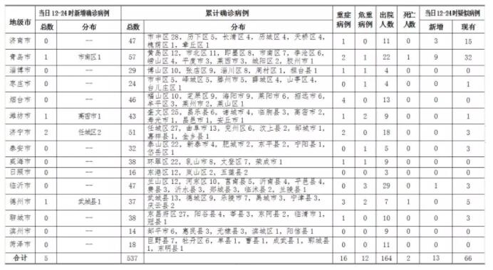 2020年2月15日12-24时,山东省报告新增新型冠状病毒肺炎确诊病例5例,累计确诊病例537例(含重症病例16例,危重症病例12例,治愈出院164例,死亡病例2例);新增疑似病例13例,现有疑似病例66例。截至目前,追踪到密切接触者15446人,已解除医学观察11801人,诊断为疑似或确诊病例281例,尚有3364人正在接受医学观察。