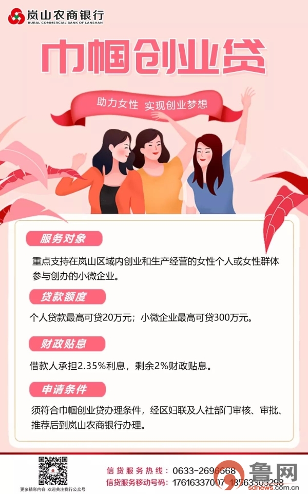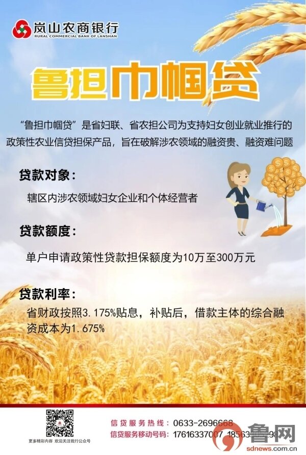 “三月绽放玫瑰贷”主要包括“玫瑰贷”、“巾帼创业贷”和“鲁担巾帼贷”三款产品,是岚山农商银行主动让利于民,践行普惠金融责任担当的充分展现。该系列贷款能够有力的保障妇女权益,营造妇女创业的良好环境,更好地为广大女性提供必要的政策保障、经济保障、生活保障和物质保障,进一步增强女性获得感和幸福感,为创建美好生活加注金融力量。(本网记者)