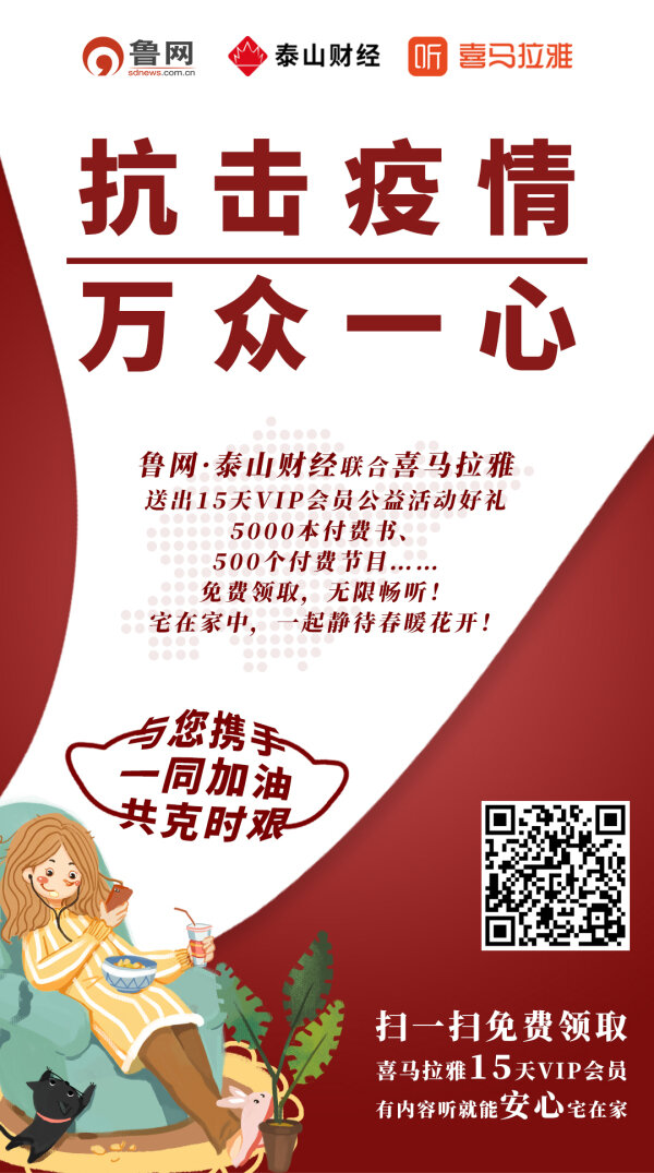 鲁网2月2日讯(记者 张佳伟) 疫情当前,一线的医务工作者们正在冲锋陷阵。我们能做的仅仅是宅在家里,为切断病毒的传播贡献一份力量,但被隔离的是病毒,隔不断的是人心!疫情面前,没有人是孤岛。为此,鲁网·泰山财经联合喜马拉雅音频平台,送出2万份15天VIP会员资格,陪您远离疫情,充实假期!