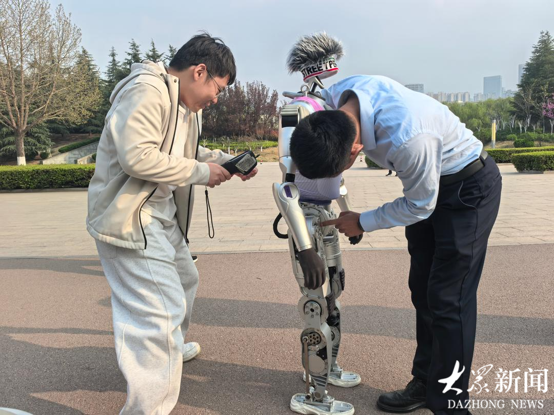 4月1日下午3点半,济南齐鲁软件园内,来自山东优宝特智能机器人有限公司(以下称“优宝特”)研制的人形机器人“行者泰山”,正在进行“特训”。