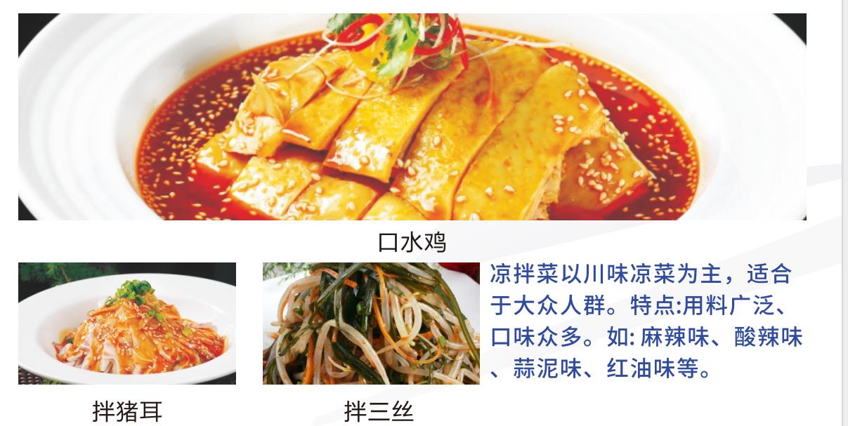 凉拌菜以川味凉菜为主,适合于大众人群。特点:用料广泛、口味众多。如:麻辣味、酸辣味、蒜泥味、红油味等。