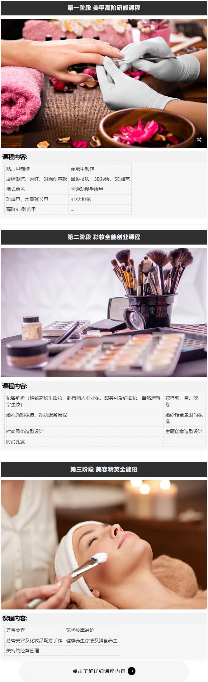 本课程是组合定制课程,课程涵盖化妆、美容、美甲三个专业,通过掌握不同化妆造型设计规范,学习时尚美容技术和形象设计的专业技能和生活美甲技术,全方位发展,培养能适应社会发展需要和职业岗位需求德智体美全面发展的应用型人才。
