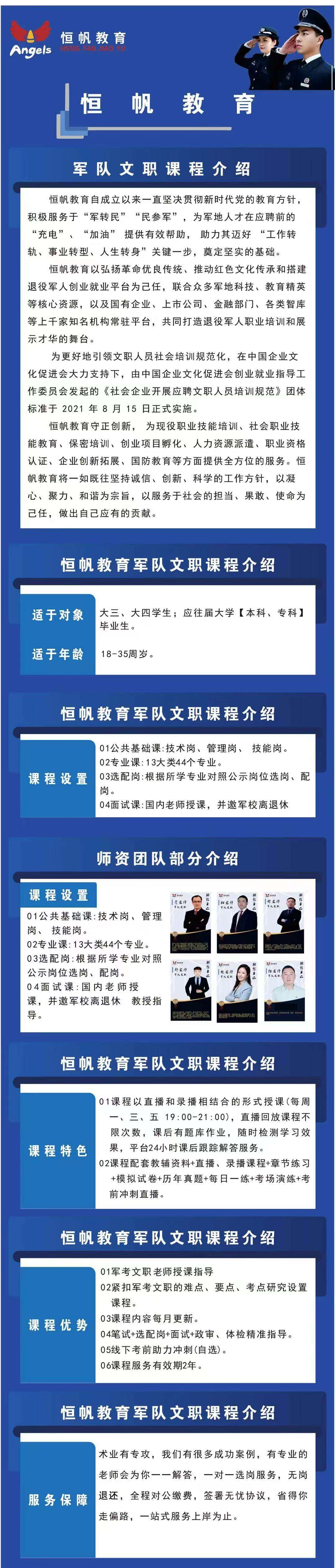 恒帆教育自成立以来一直坚决贯彻新时代党的教育方针,积极服务于“军转民”“民参军”,为军地人才在应聘前的“充电”、“加油”提供有效帮助,助力其迈好“工作转轨、事业转型、人生转身”关键一步,奠定坚实的基础。恒帆教育以弘扬革命优良传统、推动红色文化传承和搭建退役军人创业就业平台为己任,联合众多军地科技、教育精英等核心资源,以及国有企业、上市公司、金融部门、各类智库等上千家知名机构常驻平台,共同打造退役军人职业培训和展示才华的舞台。为更好地引领文职人员社会培训规范化,在中国企业文化促进会大力支持下,由中国企业文化促进会创业就业指导工作委员会发起的《社会企业开展应聘文职人员培训规范》团体标准于 2021 年8月15日正式实施。恒帆教育守正创新,为现役职业技能培训、社会职业技能教育、保密培训、创业项目孵化、人力资源派遣、职业资格认证、企业创新拓展、国防教育等方面提供全方位的服务。恒帆教育将一如既往坚持诚信、创新、科学的工作方针,以凝心、聚力、和谐为宗旨,以服务于社会的担当、果敢、使命为己任,做出自己应有的贡献。