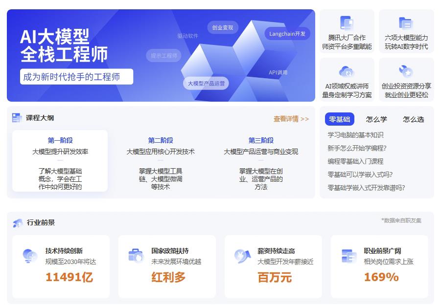 有基础发展方向:独立开发者 、大模型算法工程师 、大模型训练岗 、大模型某产品线负责人,尤其fine-tuning训练部署专业领域大模型这种非常实用且有竞争力的技术我们也会讲到。