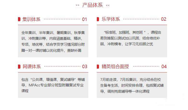 中公教育是大型的多品类职业教育机构。公司勇担时代使命,持续创造新的 市场,以友善利他之心服务社会。 面向广大知识型人群,公司主营业务横跨招录考试培训、学历提升和职业能 力培训等板块,提供100多个品类的综合职业就业培训服务。公司在全国1000多 个直营网点展开经营,深度覆盖300多个地级市,并正在快速向数千个县城和高 校扩张。 中公教育主要服务于18岁—45岁的大学生、大学毕业生和各类职业专才等 知识型就业人群。这个巨大群体广泛分布于全国各地、各级城镇和各行各业,就 业和职业能力提升是他们的两大核心诉求。职业能力高低决定了劳动生产力的高 低,是中国能否成功跨越“中等收入陷阱”的关键。而就业既是经济增长的晴雨 表,也是撬动整个职业教育领域的杠杆支点,更是职业教育机构竞争的赛场。由 此,越能较大范围、较大程度上靠近就业需求的职业教育机构,越有机会转动多 品类增长飞轮,获得统领职业教育全局的优势地位。 经过长期的探索与积淀,中公教育已拥有超过1000人的规模化专职研发团 队,5000人的大规模教师团队,总员工人数13000多人。依托卓越的团队执行 力和全国范围的垂直一体化快速响应能力,公司已发展为一家创新驱动的高增长 企业平台。中公考研是中公教育旗下品牌,秉承着——“专业、高效、深度、服务 ” 的办学宗旨,依靠强大的师资阵容和深厚的自主研发实力,以学员服务为根本,以 革故鼎新为动力,以追求卓越为目标,致力于为广大学员提供专业的教学服务。 中公考研产品齐全,为广大考研学子提供全套复习辅导课程,包括周末乐学、全日 制集训营、VIP一对一公共课、VIP一对一专业课、精品网课、考研直播课、推 免、留学等一系列产品,满足不同考生的个性化学习和备考需求。 中公考研拥有一支深耕考研教学多年的资深专业辅导团队,下设政治、英语、 数学、联考综合及专业课等40+考试研究院,拥有门类齐全的全职教研师资团队, 教授科目涵盖考研政治、英语、数学、管理类联考综合(初数、逻辑、写作)、专 业课(经济学、教育学、法学、管理学、心理学、医学、艺术学、MTI、计算机、 国际中文教育硕士等)及推免、复试、调剂等。中公考研突破性实现辅导行业师资 团队的专业化、科学化分工,旨在为学员提供专业、高效的考研辅导。 中公考研将始终秉持“学员的事就是最重要的事”这一理念,助力考研学子扶 摇直上,奔赴梦想。TOP教学体系 中公考研研究院独创"TOP"教学系统,为考研学子量身定制全方位的教学学习系统,针对全国研究生入学考试的复习特点、考试要求和发展趋势,中公考研考试研究中心进行了深入研究,打造了系统化、精细化、切片化的教学体系,旨在实现*精准(Targeted),*高效(Optimal),*专业(Professional)的辅导效果,经过多年教学实践,已帮助上万考生轻松备考、实现考研目标。 十项贴心精细服务体系 中公考研为考研学子提供贴心精细的全程服务,全方位的保障,通过“38人公共课小班课、专业课1对1授课及答疑、全日制学管师督学、择校择专业、高分作文批改、标准复试课程、精确诊断面授答疑、在线平台答疑、在线补课系统、全套初试辅导书讲义”十项服务,帮助考生缔造高分佳绩,实现上岸梦想! 业界*强大的师资团队 中公考研拥有一支业内人数*多、阵容*强的专业辅导团队,强大的师资队伍现已拥有逾350名专职辅导教师。中公考研教研中心汇集了以彭学军、李擂、杨凤芝、白纯洁、张静老师为核心的业内辅导专家,以及杨武金、谷衍奎、张能彦、赵丽英等业资深辅导专家,拥有深厚的考研专业背景,融汇了中国科学院、北京大学、清华大学等国内学校的文化特质,率先实现了考研辅导行业师资团队的专业化、精细化、科学化分工,下设政治、英语、数学、专硕、及专业课考试研究院,为考生的学习备考提供专业化、全方位的指导服务。 此外,中公考研还与人民日报出版社合作建立“考试编辑中心”,同人民日报出版社,世界图书出版公司,立信会计出版社,西南财经大学出版社等建立了良好的战略合作关系,每年出版发行千余种图书产品。是国内*大的独立知识产权教育服务产业实体!