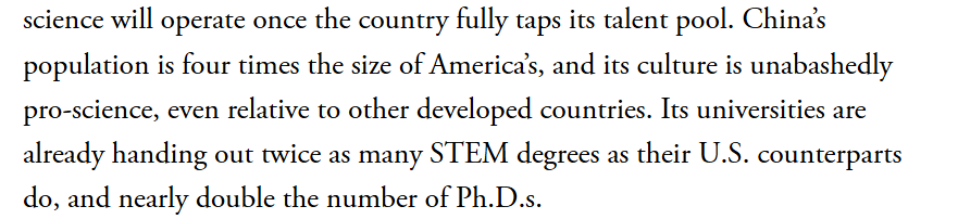 与此同时,中国在人才供给方面的优势也日益突出,科研后备力量持续扩充。文章指出,中国人口规模约为美国的四倍,社会文化整体也更重视科学教育。如今,中国高校授予的STEM学位(科学、技术、工程和数学学位)数量已是美国高校的两倍,博士毕业生数量也接近美国的两倍。