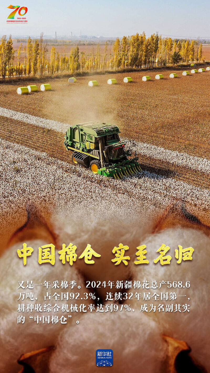 正是丰收好光景,天山南北仓廪实。今年是新疆维吾尔自治区成立70周年,70年来新疆农业生产发生了翻天覆地的变化:人均口粮从不足200公斤到粮食单产跃居全国第一;棉花占全国总产量的比重超过九成;离海最远的新疆成为多种海鲜出口地;皮亚曼的石榴、吐鲁番的葡萄、库尔勒的香梨、阿克苏的苹果……更是甜醉了全国人民的味蕾。让我们跟随这组海报,领略丰收里的大美新疆。