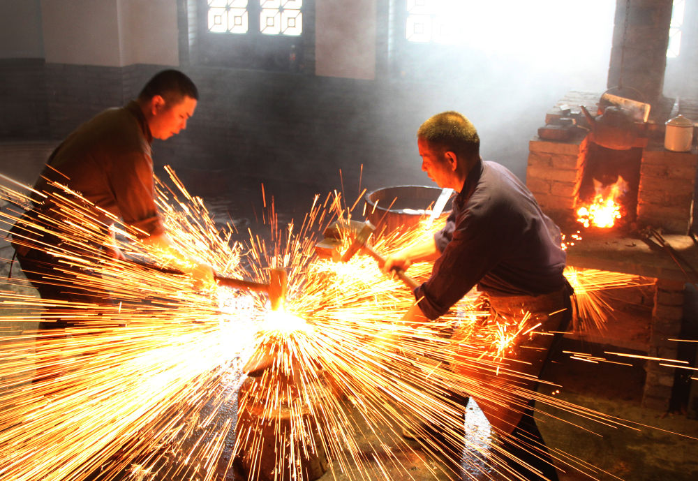国家级非遗代表性传承人、沈广隆剑铺第四代传人沈新培(右)与第五代传人沈州锻造宝剑。(受访者供图)