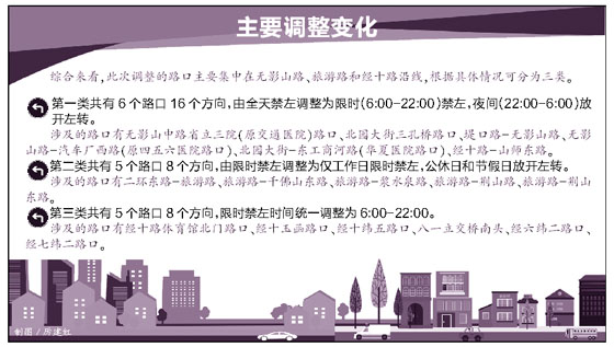 “除了二环东路旅游路路口之外,此次全市共有16个禁左路口32个方向调整了禁左时间。”据济南市交警支队交通处民警商振华介绍,“在保障安全和畅通的前提下,交警部门最大限度放开了夜间和休息日的左转,并统一了日间禁左的时间段。”