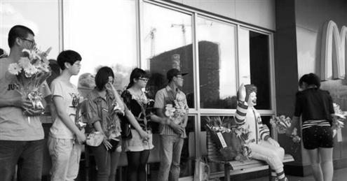 6月1日,山东招远一家麦当劳餐厅门口聚集了不少自发前来悼念的民众,他们手持鲜花、表情悲哀,一些人还不禁痛哭